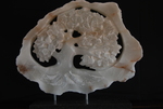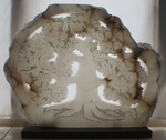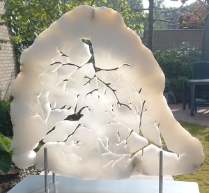 2019Een opengewerkte albast, waar het licht doorheen schijnt. Zowel door de openingen als door de steen. De dikte van de steen varieert sterk, waardoor het licht afhankelijk van de dikte meer of minder instaat is om de steen heen te komen.