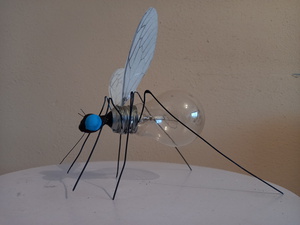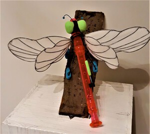 2021Libelle met als body een plastic blokfluit. Draagt een mes bij zich. Geplaatst op een boomschors.