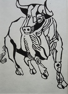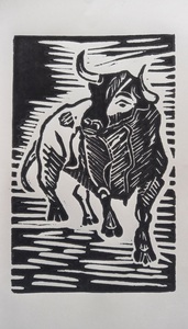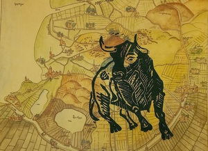 2024Stier, linosnede, op oude landkaart