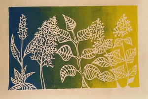 2023Lino met florale elementen in de kleuren groen, blauw en geel.